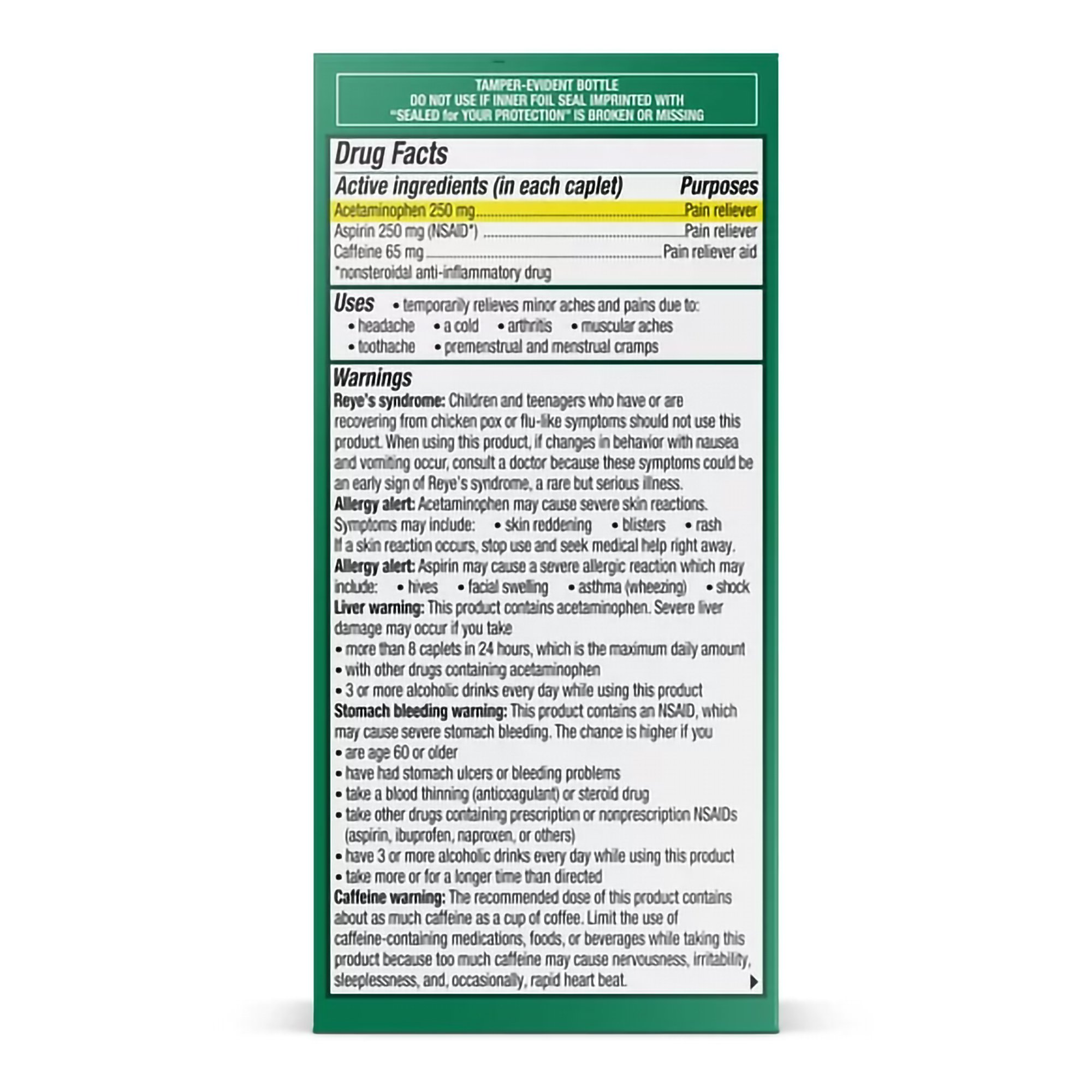 • There are 250 milligrams of acetaminophen; 250 milligrams of aspirin; and 65 milligrams of caffeine in each capsule